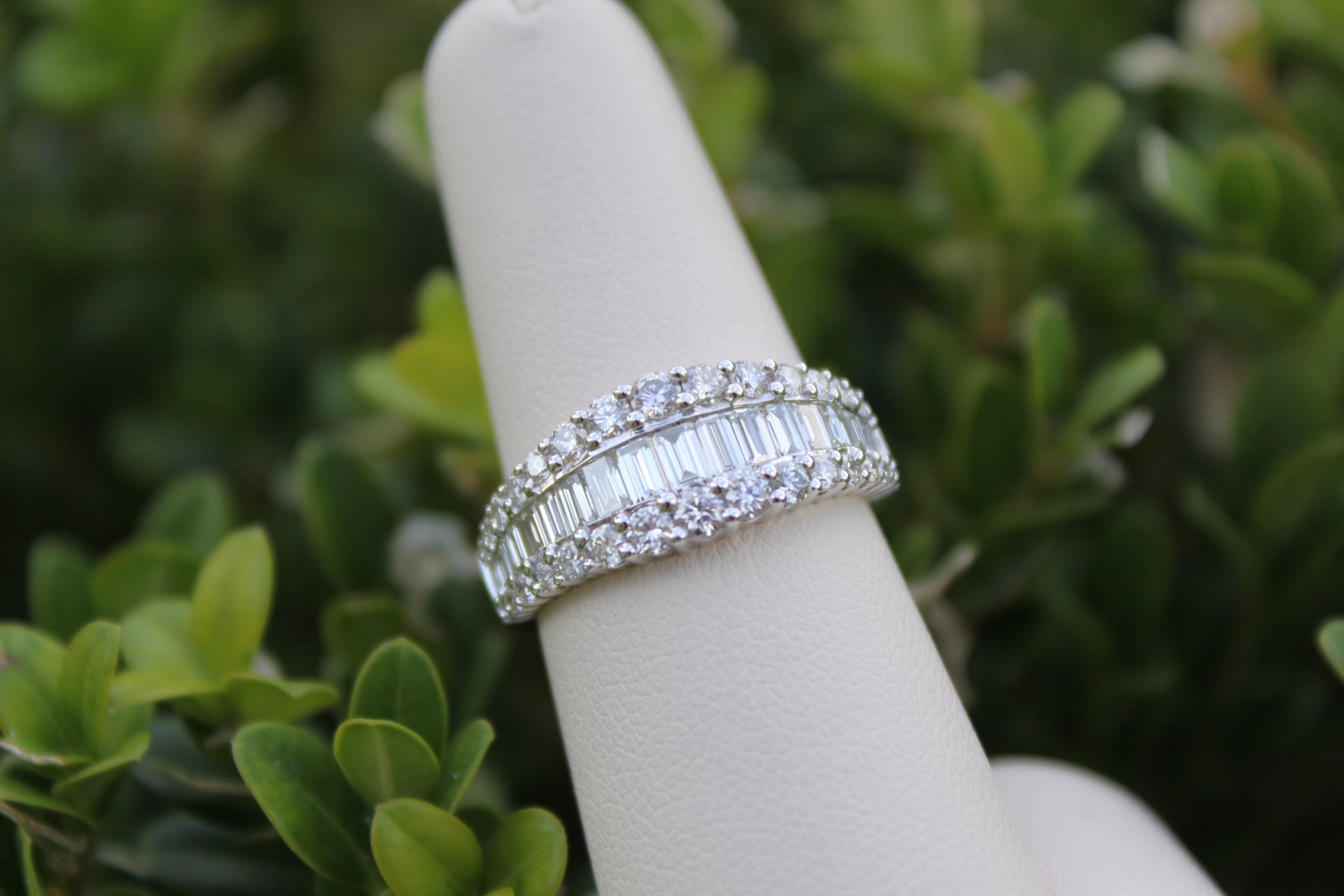 Crafted from 14K white gold, this ring features an impressive display of 2 carats worth of sparkling diamonds, including both round and baguette cuts. With its timeless beauty and classic elegance, it makes for a stunning gift.