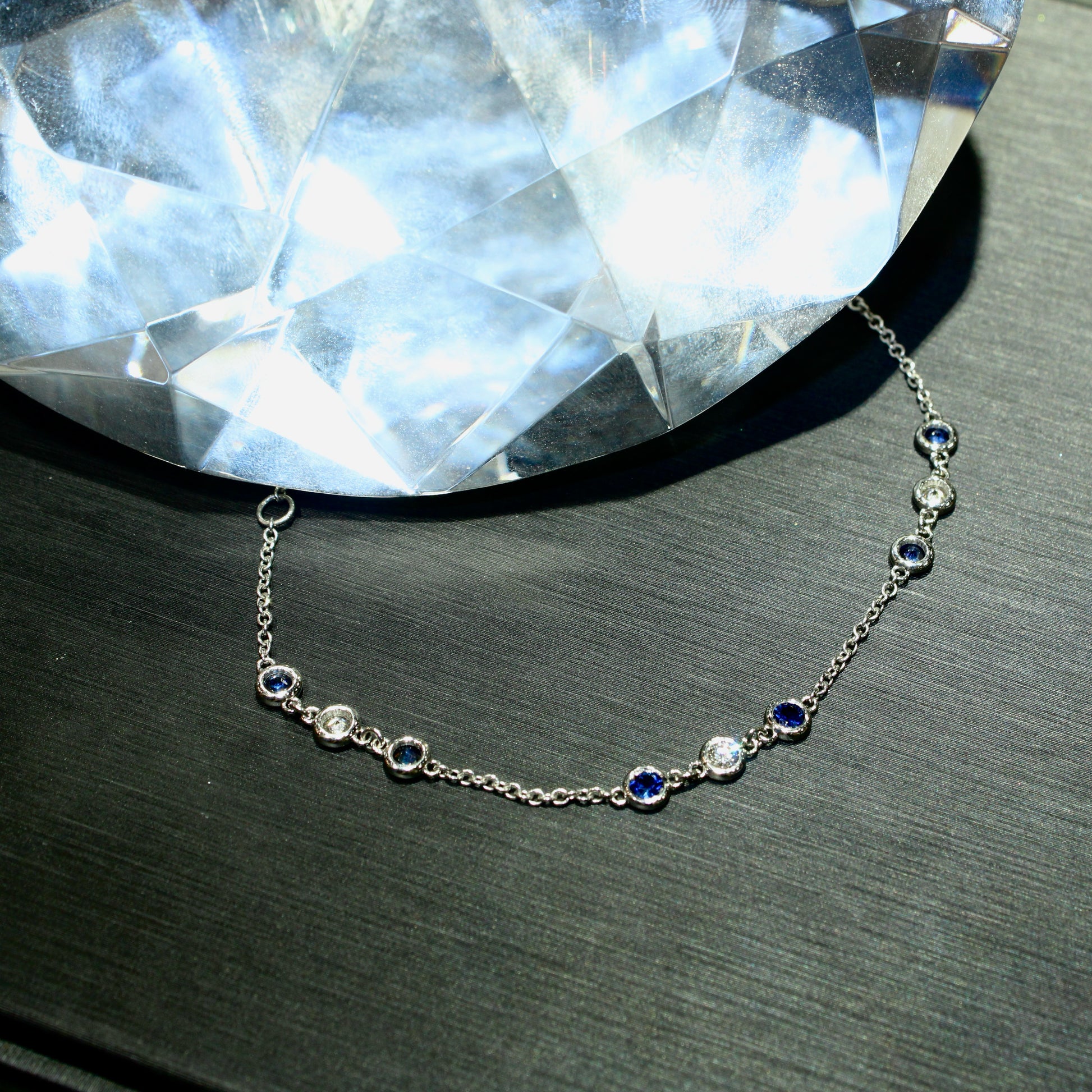 Crafted in elegant 14K white gold, this exquisite bracelet features a harmonious blend of .78 carats total weight bezel-set sapphires and .33 carats total weight bezel-set diamonds. The secure bezel setting enhances the brilliance of each gemstone while offering a sleek, modern silhouette. Measuring 7 inches in length, this gorgeous piece is perfect for both everyday wear and special occasions. This bracelet’s refined simplicity makes it an essential and adaptable piece for your jewelry collection, perfectly blending elegance with timeless beauty.