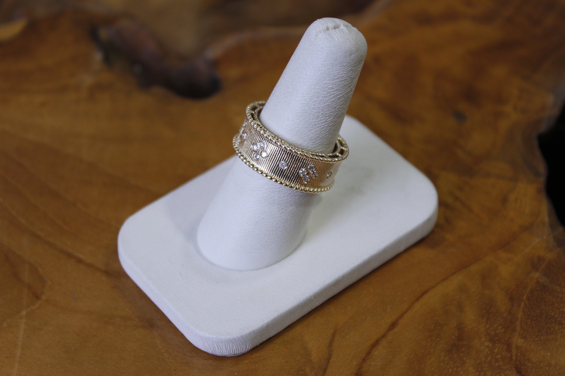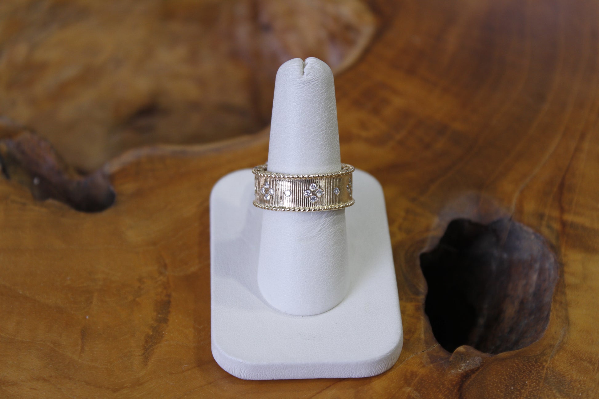 This luxurious ring boasts a stunning 14K yellow gold design with intricate beaded edges and a total diamond weight of 0.41CTW. Elevate your fashion game with this eye-catching piece, complete with vertical line detailing for added texture and dimension.