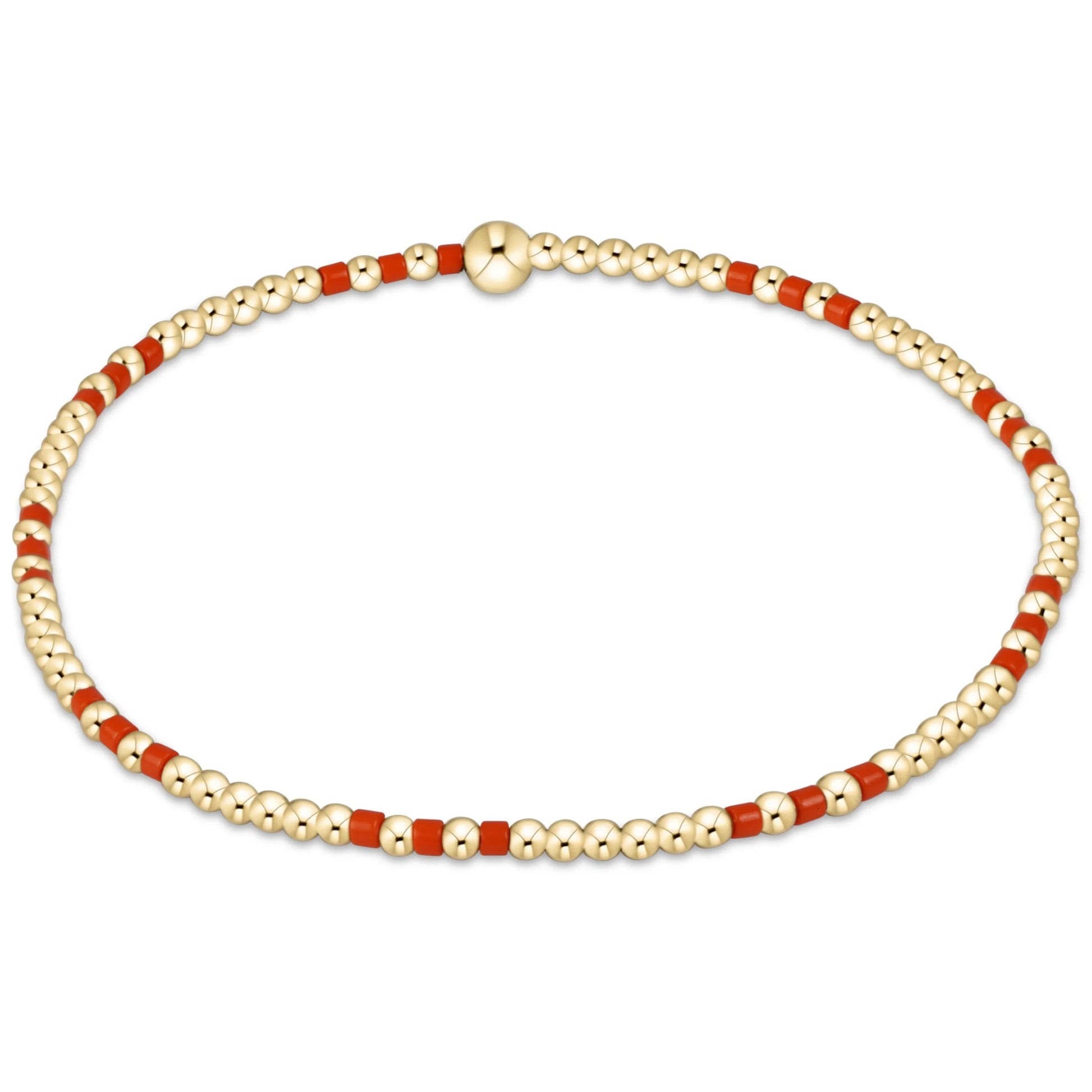 Say hello to our GAMEDAY collection! This bracelet features a vibrant mix of colorful 2mm seed beads and shining 14k gold-filled beads. At a standard size of 6.25", it’s hand-beaded on stretchy high-performance elastic, making it easy to slip on and off. Wear it without a care—sleep, shower, and sweat all you want! It pairs perfectly with other bracelets in your favorite UF Gator colors. Go Gators!