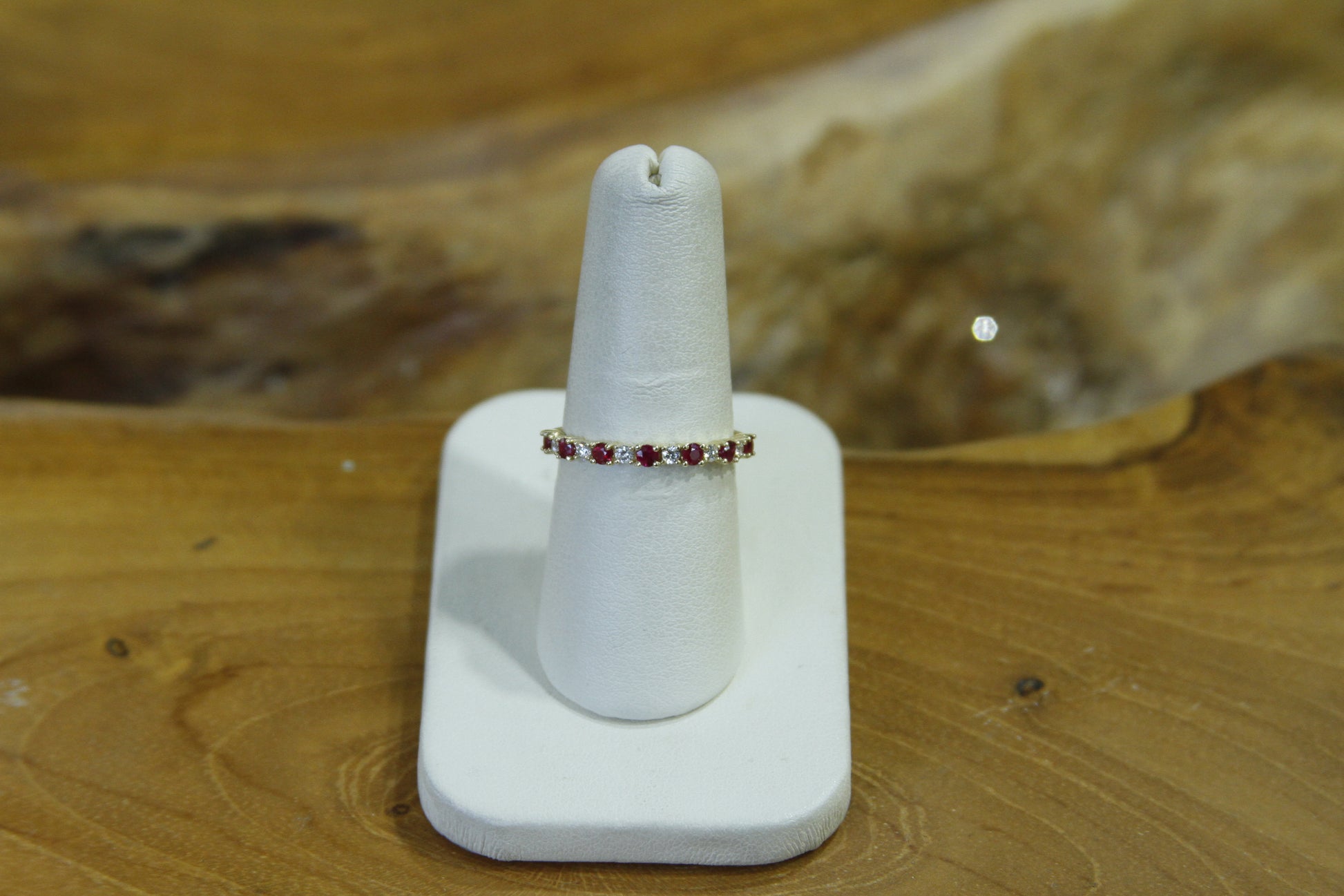 Discover the refined beauty of our 14K yellow gold Ruby and Diamond Band. Featuring a captivating display of .35CTW rubies and .12CTW diamonds, this expertly crafted piece is meticulously set by our skilled jeweler, guaranteeing unparalleled quality. An essential addition to any collection of fine jewelry.