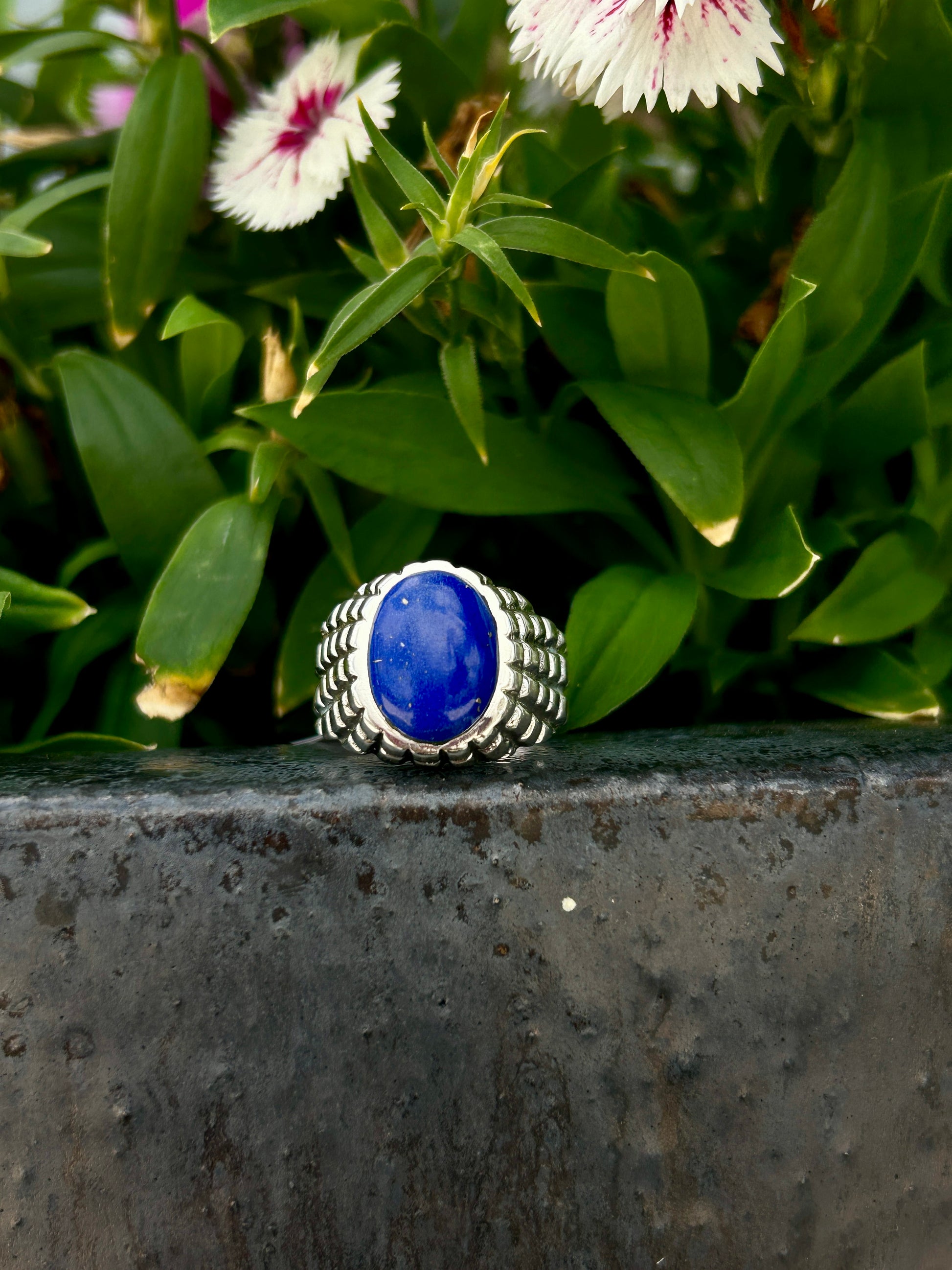 This delicate silver ring is set with a large oval-cut blue center stone, creating an elegant and stylish look. Its classic design ensures you will wear this piece of jewelry for years to come.